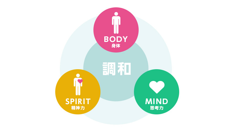 自分の身体を全て使いこなすことがピラティスの目的。そのためには、『身体:BODY』『精神力:SPIRIT』『思考力:MIND』の調和が不可欠です。