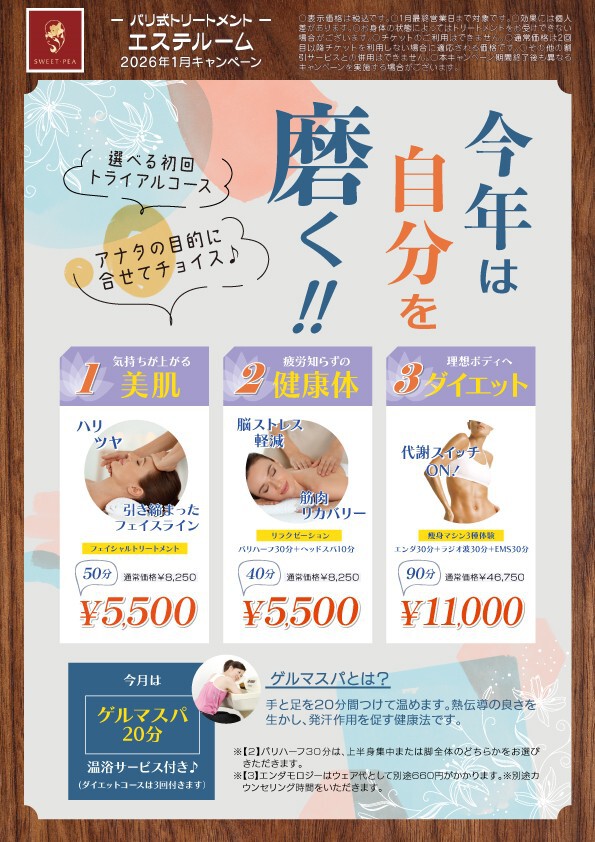 1階Aスタジオ奥エステルームからのお得なキャンペーンのご案内です。