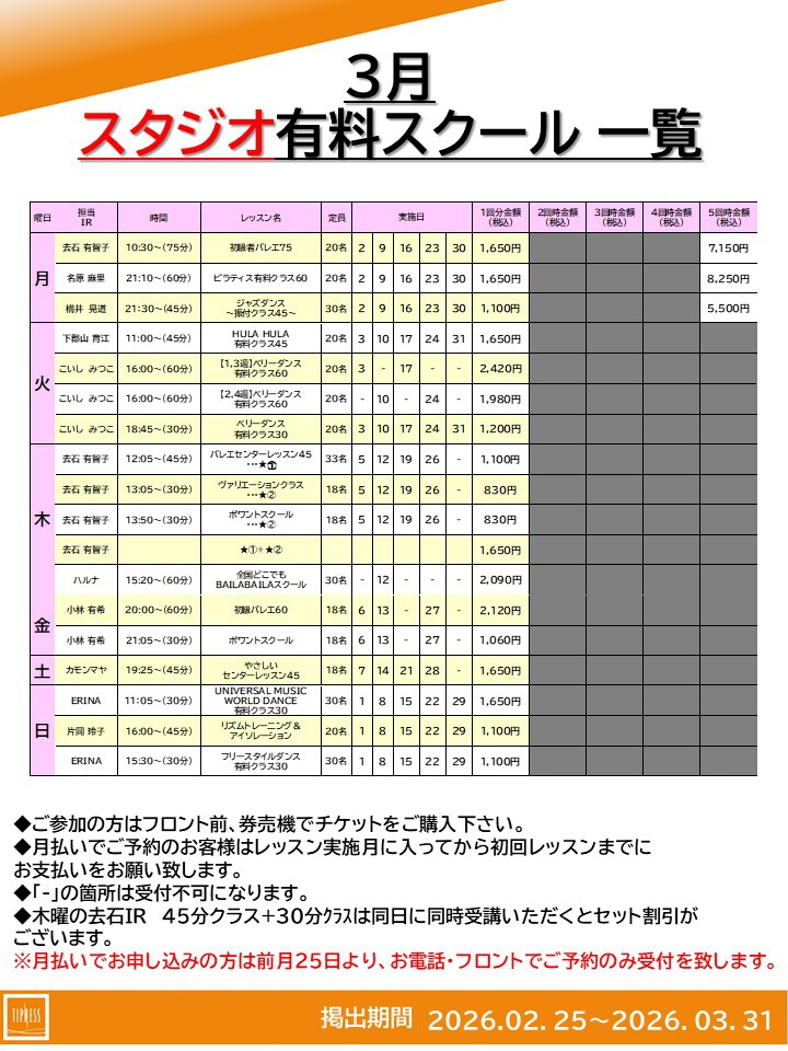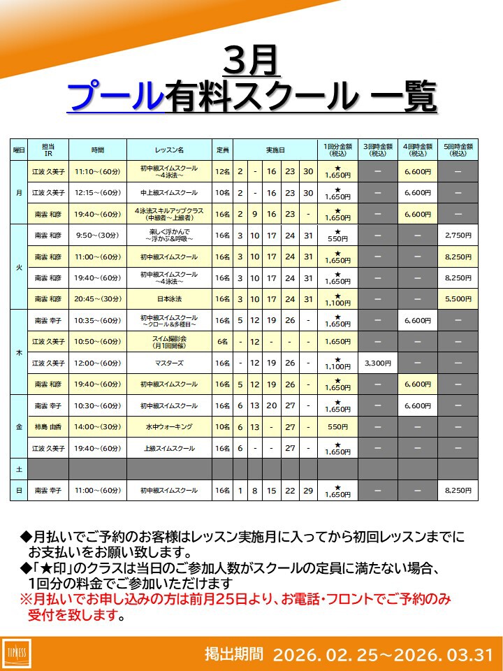 2026年3月 有料スクール日程一覧表