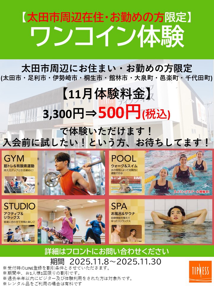 【太田市周辺在住・お勤めの方限定!ワンコイン体験】